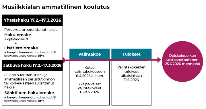 Yhteishaku ja jatkuva haku musiikkialan perustutkintoon johtavaan koulutukseen (muusikko) on 17.2.–17.3.2026. Kuopion konservatoriossa voi suorittaa musiikkialan perustutkinnon (180 osp) sekä tutkinnon osia tai täydennyskoulutuskokonaisuuksia (15–145 osp). Koulutus toteutetaan lähi- ja monimuoto-opetuksena. Meillä voi suorittaa myös kaksoistutkinnon.